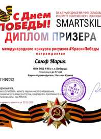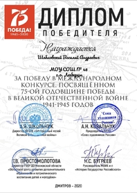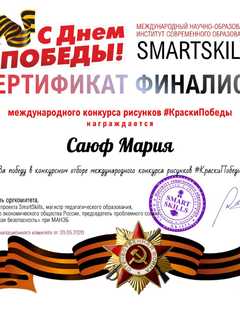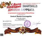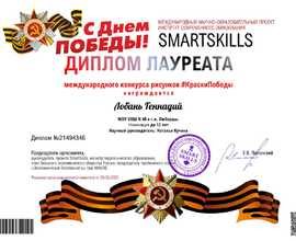 Сертификат финалиста, диплом призёра и дипломы лауреатов международного конкурса рисунков "Краски Победы"