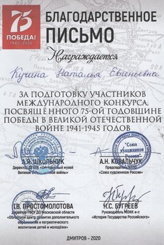 Благодарственное письмо за подготовку трёх победителей и призера в интеллектуально-творческом и исследовательском конкурсе, посвященном 75-летию Победы в Великой Отечественной войне( II творческий литературный тур)