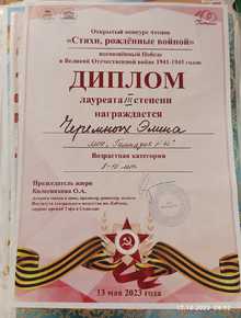 Диплом призёра (3 место) открытого конкурса чтецов "Стихи, рождённые войной", посвященного Победе в ВОВ